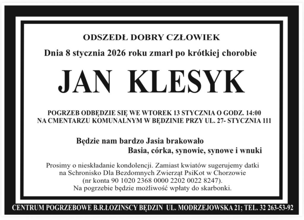 Pogrzeb odbędzie się 13 stycznia 2026 r. o godz. 14.00 na cmentarzu komunalnym w Będzinie przy ul. 27 stycznia 111.